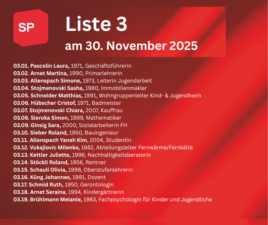 Am 30. November 2025 finden in Wohlen wieder die Einwohnerratswahlen statt. Die SP Wohlen tritt mit der Liste 3 auf, dabei müssen wir unsere 6 Sitze im Einwohnerrat verteidigen, um einen weiteren Rechtsrutsch zu verhindern. Also, unbedingt die Liste 3 wählen!